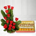 This gift combo has: - 18 Red Roses - Mixed Sweets from Haldirams (500g) An ideal combo of 18 bright Red Roses Arrangement with 1/2 Kg Mixed Sweets from Haldirams or a reputed sweets shop to surprise and delight your loved ones on their special occasion.