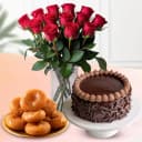 This gift combo includes: - 12 Red Roses in Glass Vase - Chocolate Cake (1 Lb) - Badusha (500g) Express your deepest emotions with this elegant gift combo featuring 12 red roses in a glass vase, a rich chocolate cake, and 500 grams of Badusha. The roses, symbolizing love and passion, are beautifully arranged in a clear glass vase, adding a touch of sophistication to any space. Paired with this floral elegance is a decadent 1 lb chocolate cake, perfect for celebrating special moments with a touch of indulgence. To complete the experience, 500 grams of Badusha, a traditional Indian sweet known for its rich and flaky texture, adds a layer of sweetness that perfectly complements the beauty of the roses and the richness of the cake. This combo is ideal for anniversaries, birthdays, or any occasion where you want to make a grand and heartfelt gesture.