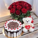 Buy this lovely combo of 25 Red Roses Arrangement with 1 Lb Black Forest Cake and a soft Teddy Bear (6 inch) to surprise and delight your near and dear ones and make them feel special.