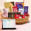 Deck the lives of the people closest to your heart with love by sending this Remarkable Chocos Gift Hamper that beautifully conveys the message of your heart to them. This Hamper includes- a) Cadbury Mini Celebration Pack (64.2 gm) b) 16 pcs Ferrero Rocher Moments (69.6 gm) c) 2 pcs Lotte Chocopie d) 6 pcs Pineapple Flavoured Handmade Chocolate e) Cadbury Dairy Milk Fruit N Nut Bar (36 gm) f) Nestle KitKat (37.5 gm) g) 6 inch Teddy h) Desk Calender i) Cane Basket