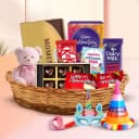 Deck the lives of the people closest to your heart with love by sending this Remarkable Chocos Gift Hamper that beautifully conveys the message of your heart to them. This Hamper includes- a) Cadbury Mini Celebration Pack (64.2 gm) b) 16 pcs Ferrero Rocher Moments (69.6 gm) c) 2 pcs Lotte Chocopie d) 6 pcs Pineapple Flavoured Handmade Chocolate e) Cadbury Dairy Milk Fruit N Nut Bar (36 gm) f) Nestle KitKat (37.5 gm) g) 6in Teddy h) Birthday Party Accessories i) Cane Basket