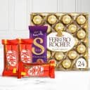 This gift hamper has: - 24 pcs Ferrero Rocher Chocolate Box - Dairy Milk Silk Chocolate Bar (60g) - 3 pcs Kit Kat (13g each) Prepare to be pleasantly surprised with the ultimate chocolate experience. This gift hamper is a true delight, featuring the perfect combination of Ferrero Rocher, Dairy Milk Silk, and Kit Kat. With 24 pieces of Ferrero Rocher chocolates, a smooth and creamy Dairy Milk Silk chocolate bar (60g), and three delightful Kit Kat bars (13g each), this hamper will transport you to a world of chocolate bliss. Treat yourself or gift it to someone special for a truly unforgettable surprise.