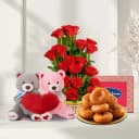 Elevate your romantic gestures with our exquisite gift selection. Picture a delightful basket overflowing with 15 radiant red roses, each petal a testament to love's vibrancy. Complementing the floral beauty are 250 grams of Badusha, a sweet delight renowned for its crispy shell and rich syrup that will tantalize your taste buds. Adding a touch of whimsy are two adorable twin teddies, perfect for cuddling and sharing affection. This gift basket embodies love and joy, ideal for anniversaries, Valentine's celebrations, or any cherished occasion. Let this unique offering convey your deepest emotions.