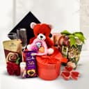 Give this incredible Valentines Day gift of Romantic Evening Date Aromatic Hamper to express the tenderness of your love for someone you adore. This Valentines Day Gift Hamper is presented with: 1. IRIS Potpourri, 2. Cadbury Dairy Milk Silk, 3. 3 pc Heart Shape Handmade Chocolates, 4. Love Book Handmade Chocolate Bar, 5. N Stirred Cocktail Mix, 6. 2 Wine Glass, 7. 3 pc Heart Shape Candles, 8. 6in Cute Teddy, 9. Secret Message Jar, 10. Red Velvet Rose and 11. A Red Heart Shape Box.