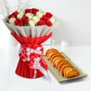 This gift combo includes: - 25 Red and White Roses Arrangement - Khova Gujia (500g) This elegant gift combo pairs a stunning arrangement of 25 red and white roses with 500 grams of Khova Gujia, creating a delightful blend of beauty and tradition. The roses, meticulously arranged in a harmonious display of passionate red and pure white, symbolize deep love, unity, and respect, making this arrangement perfect for anniversaries, weddings, or any occasion that celebrates meaningful connections. Complementing the floral beauty is Khova Gujia, a traditional Indian sweet known for its rich, creamy filling encased in a crispy pastry. Each bite of the Gujia offers a burst of sweet, comforting flavors that perfectly match the elegance of the roses. This combo is an ideal way to convey your heartfelt emotions with a touch of classic sweetness.