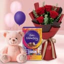 This gift combo has: - Red Roses (3 pcs ) that has been decorated with a tissue - One Cadbury Mini Celebration Gift Pack (70 gms) - A cute Small Teddy (6 inches) - Colorful Balloons (3 pcs). Open your heart out with this amazing Online Gift Combo. This ideal gift set is sure to impress your loved ones.