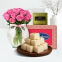 Celebrate love with our Rosy Indulgence Gift Set, where the charm of pink roses meets gourmet delights. Picture a stunning arrangement of ten soft pink roses, radiating beauty and affection. This charming bouquet comes paired with the rich Cadbury Temptations infused with rum and raisins, a heavenly treat for the senses. Adding to the experience is a classic coconut barfi, a chewy, coconut-flavored delight that complements the floral elegance perfectly. Whether for a birthday, a thank you gesture, or a surprise gift, this set brings joy to any occasion.