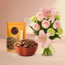 Shop Royal Almond Treat (250 g) from Shree Mithai with 8 Pcs Flowers Bouquet (Pink Lily, White Carnations N Pink Roses) to wish your loved ones on their special days. (Only Available at Chennai)