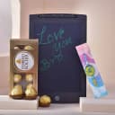 This gift set has: - Kids Rakhi Set Of Two - Ferrero Rocher Chocolate 8 Pcs - Digital Writing Pad Make this Raksha Bandhan extra special for your little brother with this adorable and fun-filled Kids Rakhi Gift Set. It features a vibrant set of two playful Kids Rakhis that will surely bring a smile to his face. The pack includes a delicious 8-piece Ferrero Rocher chocolate box, perfect for a sweet celebration. To spark his creativity, the set also comes with a Digital Writing Pad—ideal for doodling, learning, and endless fun. This cheerful gift combines love, learning, and sweetness all in one thoughtful hamper.