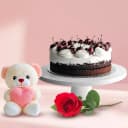 This gift combo has: - A Single Red Rose - A Black Forest Cake (1Lb) - A Small Teddy (6 inch) This gift of Single Red Rose with Small Teddy (6 inch) N 1 Lb Black Forest Cake will mesmerize the people whom you send this.