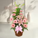 Brighten someone's day with the Soft Bloom Basket Surprise! This enchanting arrangement features 3 charming Pink Lilies, 6 gentle Peach Carnations, and 6 vibrant Pink Gerberas, thoughtfully arranged in a lovely basket. Perfect for any occasion, this delightful selection expresses your heartfelt emotions, creating a special moment that will be cherished. Each flower adds its unique charm, seamlessly combining to symbolize the warmth of your relationship. Surprise a loved one simply because they matter!