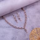 Discover the exquisite beauty of Nimoraa's Sophisticated RoseGold Necklace Ensemble, adorned with radiant AD stones. This elegant jewelry collection showcases a stunning rose gold finish that resonates with timeless appeal. The stylish semi-choker design of the necklace effortlessly complements both silk and sequined attire, while lending a refined touch to any occasion, including formal farewell gatherings. The earrings feature delicate pear-shaped white stones that delicately sway, adding a touch of brilliance to your outfit.