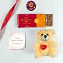 This gift consists of: - 1 Raksha Bandhan Chocolate Bar (35g) - 1 Teddy - 1 Greeting Card Treat your sibling to a special Rakhi combo this year! It includes a scrumptious chocolate bar, an adorable teddy companion, and a sweet greeting card to express your love.