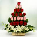 Bring smiles on the faces of your dear ones with this gift of Stunning Mixed Roses N White Orchids Basket and make your bond stronger. Product Details: Flowers: 13 Red Roses, 7 Pink Roses, 5 Stem White Orchids Gift Type: A Basket Arrangement
