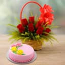 Present your loved ones this Stunning Red Roses Rounded Basket with Vanilla Cake. This flowers N cake combo includes: Details: No. of Flowers: 12 Type of Flowers: Roses Flower Color: Red Type of Arrangement: Rounded Basket with Handle (decorated with Red Satin Ribbon) Type of Cake: Vanilla Cake Shape of Cake: Round Weight: 1/2 kg.
