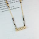 This modern mangalsutra features a sleek gold bar pendant embellished with sparkling cubic zirconia, fusing traditional charm with contemporary elegance. Its delicate gold-plated chain, paired with timeless black beads, makes it a versatile choice for any occasion. Lightweight and sophisticated, this necklace beautifully accentuates the collarbone, making it perfect for weddings, professional settings, or casual outings. A splendid addition to any jewelry collection, this piece also serves as a thoughtful gift for anyone who treasures modern class.