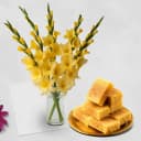 Illuminate your living space with the radiant beauty of yellow gladiolus, symbolizing joy and warmth. This arrangement of ten brilliant blooms is presented in a captivating glass vase, perfect for bringing the outdoors inside. Accompanying these flowers is the exquisite Mysore Pak, a traditional Indian sweet that melts in your mouth, weighing 500 grams. This delightful duo is an ideal choice for celebrating milestones or expressing heartfelt sentiments. Bring joy to someone special or indulge yourself with this luxurious gift! (Available only in Bangalore)