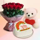 Send this Superb Combo of Pineapple Cake, Rose Bouquet n Pink Teddy and make someone feel truly special. This flowers gift combo comprises of: Details:</br) No. of Flowers: 12 Type of Flowers: Roses decorated with Gypsophila Type of Arrangement: Bouquet Type of Cake: Pineapple Cake Cake Topping: Happy Valentines Day Shape of Cake: Heart Shape Weight: 1kg Color of Teddy: Pink Size of Teddy: 12 inch Best Suited For: Valentines Day, Wife, Fiancee, Girlfriend N others