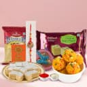 Surprise your loved ones with the Sweet Delight Festive Gift Set, a harmonious blend of flavors that celebrates every moment. This collection features classic Haldirams treats that are perfect for birthdays, anniversaries, or any special occasion. Taste the delicate Soan Papdi, the rich Kaju Katli, the crunch of Bhujia, and the sweetness of Boondi Ladoo. To add an extra layer of warmth, enjoy three artisanal chocolates in a beautifully crafted heart-shaped box, complete with a Rakhi and Roli Tilak Chawal to enhance the joy of gifting.