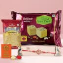 Celebrate the unbreakable bond of siblinghood with this exquisite Rakhi gift set. Featuring 200 grams of soft Haldirams Soan Papdi, a sweet treat that melts in your mouth, and 200 grams of crispy Haldirams Bhujia, this set perfectly combines tradition and flavor. Complemented with a beautifully crafted Rakhi and accompanied by free Roli Tika and Chawal, this set is a heartfelt reminder of your love and togetherness.