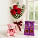 This gift combo has: - 3 Red Roses Bunch - 2 bars of Cadbury Dairy Milk Silk (55 gms each) - Teddy (6 inches) Gift this combo of Teddy (6 inches) with 3 Red Roses Bunch which is decorated with a tissue N 2 bars of Cadbury Dairy Milk Silk (55 gms) that will brighten up the day of your loved ones.
