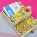 This is a gift of: - 2 pcs Rakhi (Rakhi Code: KRHAN5696, KRGAN5698A) - Gold Plated Thali - 4 pcs Ferrero Rocher Chocolate - Besan Laddu (500g) - Complimentary Roli, Tika & Chawal Thali included - Arranged in a beautiful Tray - All these comes beautifully packed in a reusable Signature Outer Box This Rakhi hamper is a beautiful blend of tradition and taste, featuring two intricately designed Rakhis (KRHAN5696 & KRGAN5698A) and a gold-plated thali to perform the rituals with grace. Accompanied by a rich serving of besan laddus (500g) and 4 pieces of Ferrero Rocher, this gift adds a sweet touch to the celebration. The roli, tika, and chawal thali completes the ceremonial essentials. Neatly presented in a decorated tray and a reusable signature box, this hamper makes Raksha Bandhan extra special.