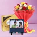Surprise your loved one with a gift that beautifully intertwines affection and flavor. The Treasured Memories with Floral Elegance features a custom 4x4 inch photo tile showcasing a cherished moment, alongside a vibrant bouquet of 15 mixed roses. Each rose symbolizes joy and romance, making this gift perfect for any occasion. And to bring sweetness to the experience, a luxurious 16-piece Ferrero Rocher Moments chocolate box is included, elevating this gift to a delightful treat for the senses. Show your appreciation in style with this thoughtful ensemble.