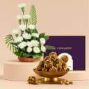 This gift combo includes: - 6 White Carnations N 6 White Gerberas Arrangement - Dry Fruits Laddu (250g) Celebrate the beauty of simplicity and the joy of wholesome flavors with this elegant gift combo. Featuring a pristine arrangement of 6 white carnations and 6 white gerberas, this bouquet exudes purity, peace, and serenity. The delicate white blooms are a perfect way to convey respect, admiration, or heartfelt sympathy. Complementing this serene floral display are 250 grams of dry fruits laddus, a nutritious and delicious treat made with premium nuts and dried fruits. This thoughtful combination of elegant flowers and healthy sweets is perfect for occasions that call for a subtle yet meaningful gesture, such as birthdays, thank-you gifts, or to convey best wishes for health and happiness.