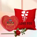 Home›Anniversary›Wonderful Personalized ILU Heart Cushion with Sapphire Heart Chocolate Box n Velvet Rose
