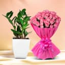 Discover the perfect fusion of beauty and greenery with our Zamia & Rosy Delight Combo. This set features a vibrant Zamia plant in a stylish pot and a stunning bouquet of fresh pink roses, symbolizing admiration and love. The Zamia not only beautifies your space but also purifies the air, while the roses create a romantic atmosphere. Ideal for expressing your feelings on any occasion, this combination is sure to bring joy to your loved ones.